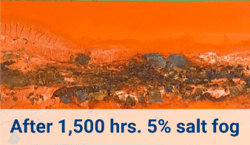 IThe American Society for Testing (ASTM) B117 “Standard Method of Salt Spray (Fog) Testing” employs a fog chamber into which are placed metal panels pre-coated with the paint-systems to be studied. A solution of 5% sodium chloride/95% distilled water is atomized at 95 F, and the resultant fog is allowed to settle on the test pieces. The test is normally run continuously until failure, that is, an unacceptable accumulation of red rust. We chose to terminate the test after 1,500 hours.